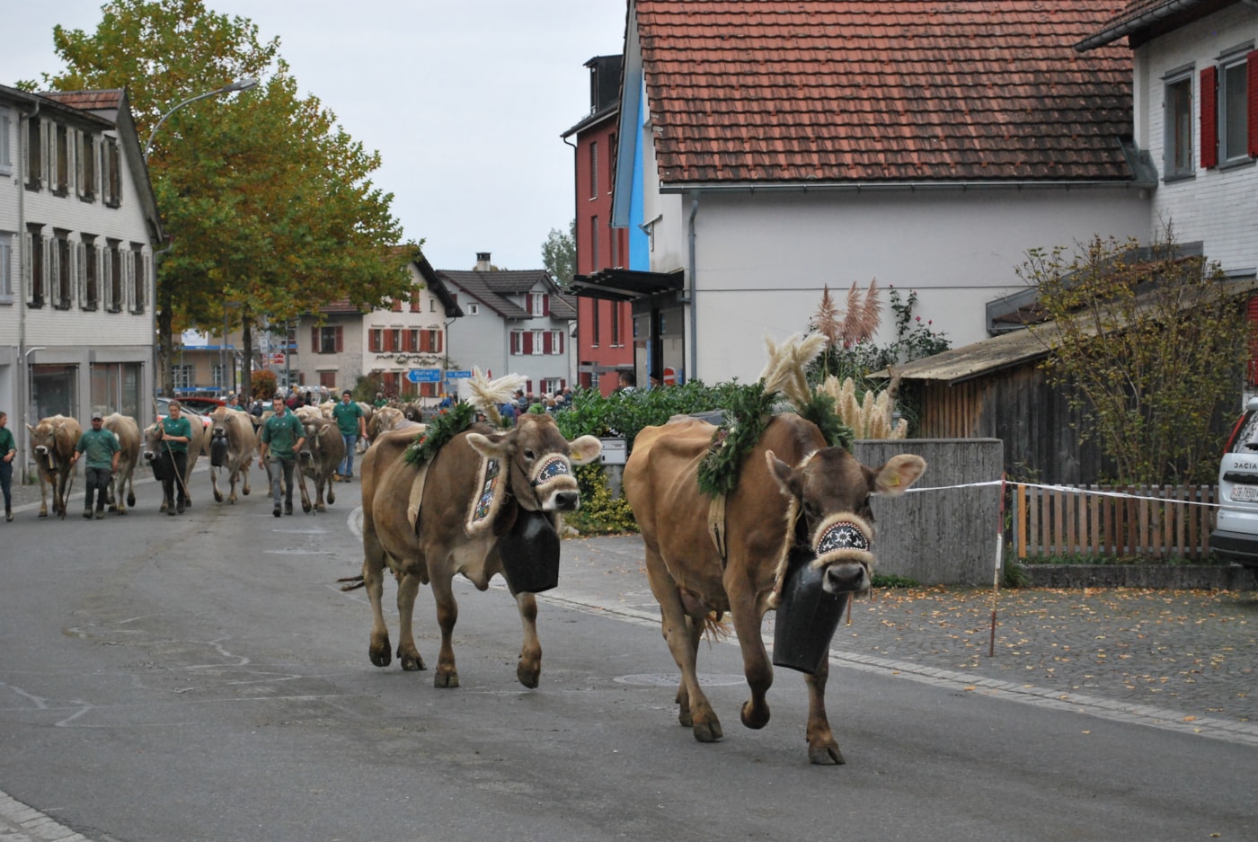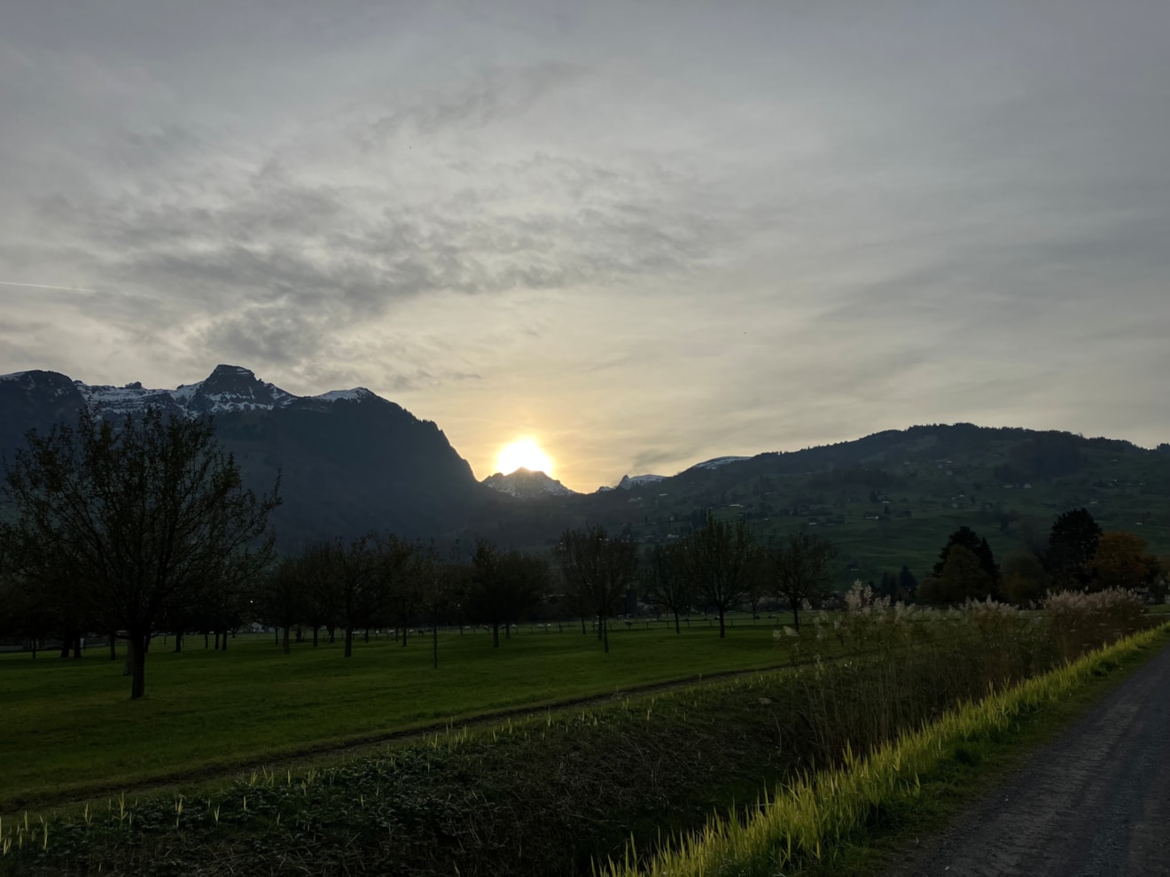 oder anstatt durs Zimätschnittäwägli, witer abä über d Stägä, lings hät mä amigs im Wintär chonä schlittlä, rechts da riisig wisse Hus, graad abä bi Goisäs fäbii, wos no ä gschtumpäti Geiss idä Wisä gha hät, bim Zahnarztblok dä Katrin tschüss gsait und fürä ad Hoptstross, übärä zum Löiä, rächts witer am Welo Keller und adä Metzg fäbii, lings hindärä id Bluemästross, fillicht hät am Migele sini Muetter gad usäm Fenschtär grüeft: Migele veniguwa!